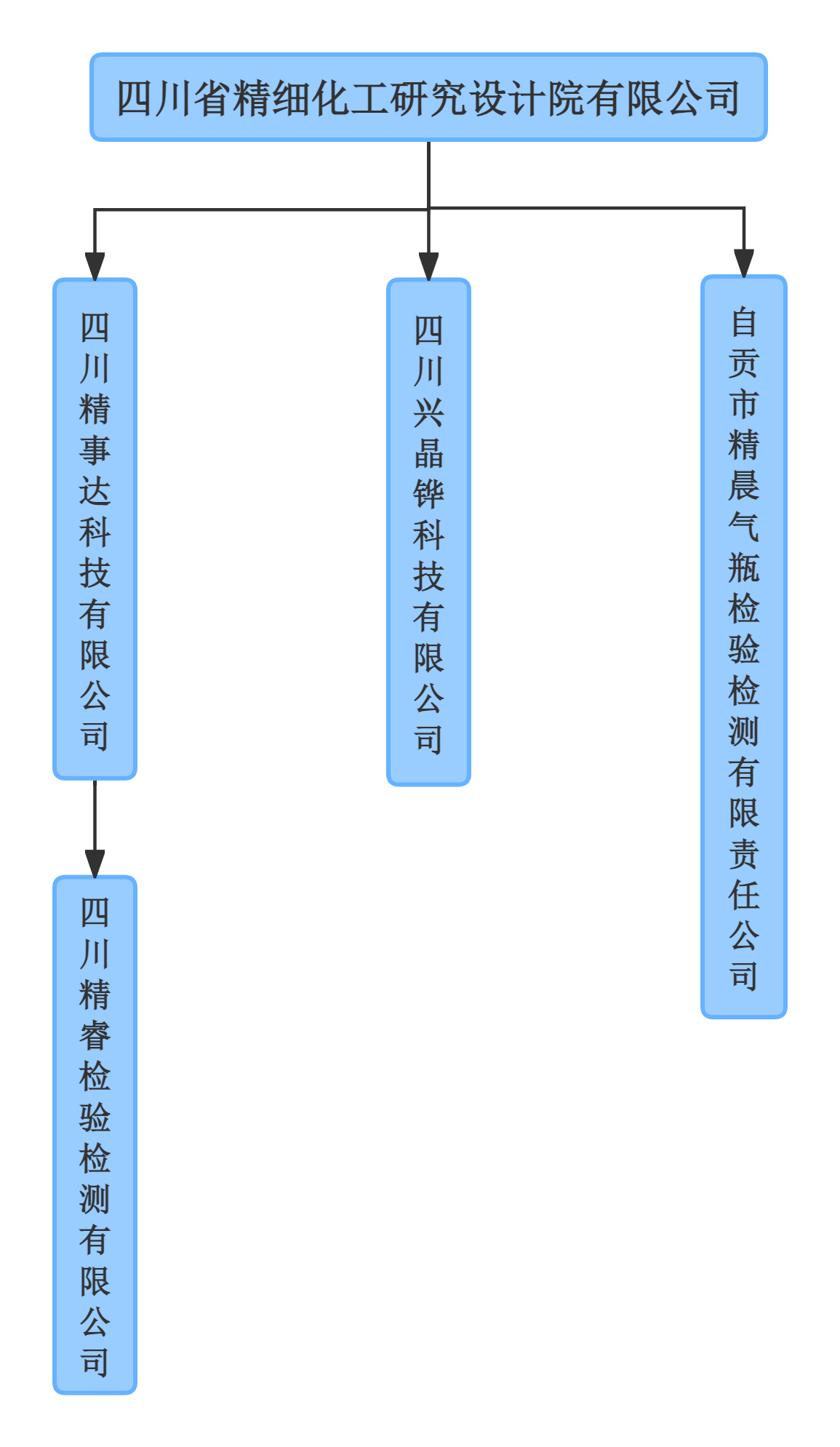 四川省精细化工研究设计院有限公司,下辖全资子公司四川精事达科技有限公司(四川彭山)、四川兴晶铧科技有限公司(四川成都)、四川精睿检验检测有限公司(四川彭山)、自贡市精晨气瓶检验检测有限公司(四川自贡)。